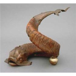 A horn table ornament, modelled as a mythical fish with brass-mounted head and tail, H 9ins £100-150