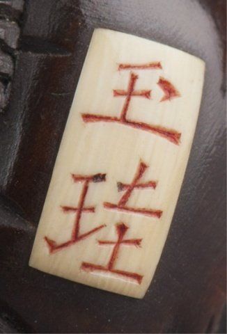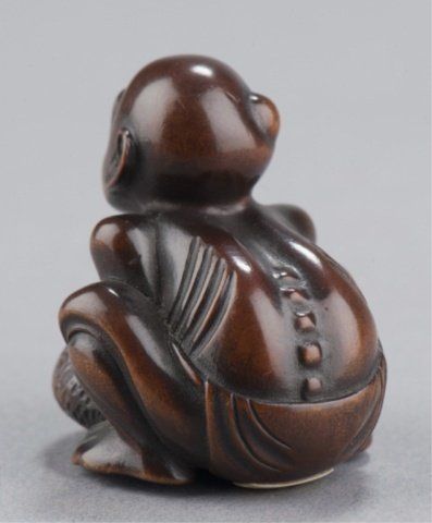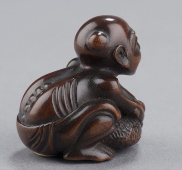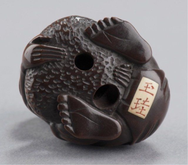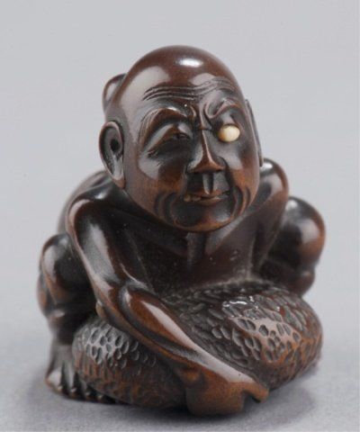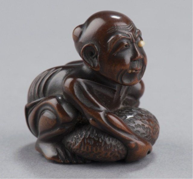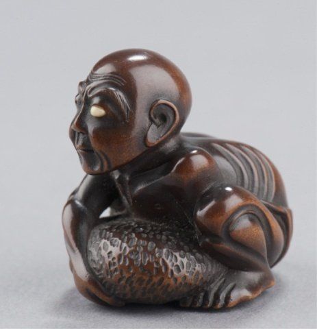 Tokyo, Mid 19th century. , Mid 19th century. With a large tumor on his scalp trying to raise himself from the ground, impeded in this effort by the weight of his hypertrophic testicle. Inscribed in inlaid ivory tablet on underside, Gyokkei. 1 3/8in (3.6cm). Provenance: Purchased from Joseph U. Seo, 1955. Exhibited: the Student Center (August 29 - September 25, 1960)
