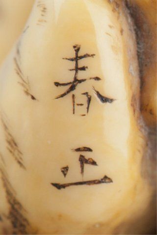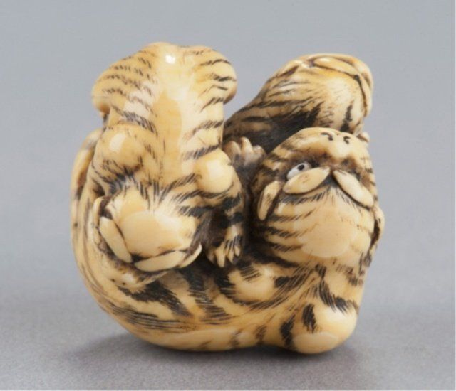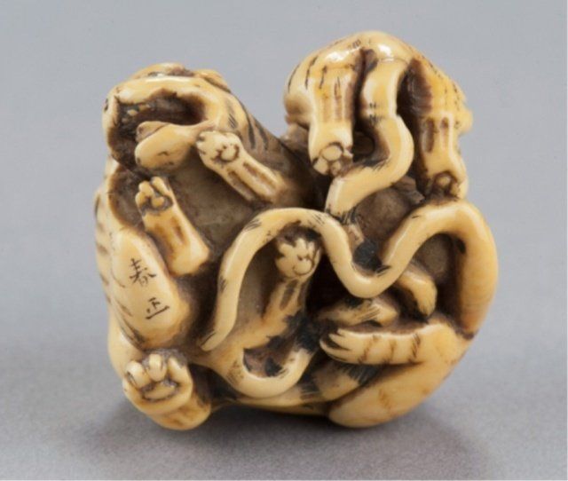 By Harumasa, Kyoto, , Early 19th century. Seated and turning to the left, one cub climbing onto his back, the other crouching beneath his jaw. The eyes inlaid with mother of pearl. Signed on the underside without reserve, Harumasa.1 1/8in (2.9cm). Provenance: Illustrated in the MCI, page 128 (Entry No. 1730A).Ex M. T. Hindson Collection, lot 381.Illustrated in Davey, Fig. 211. Ex Gordon Smith Collection.
