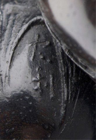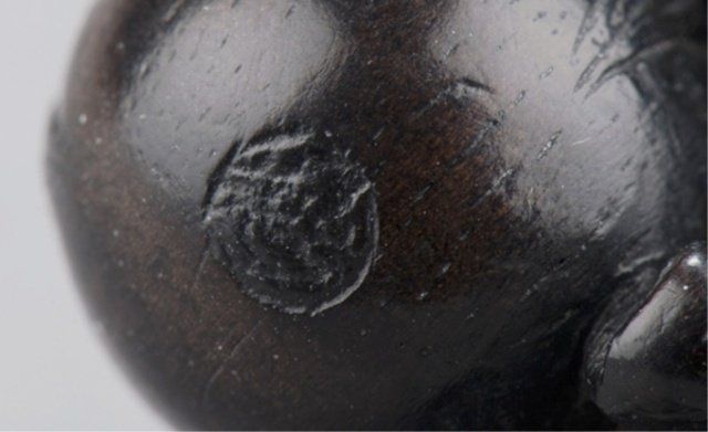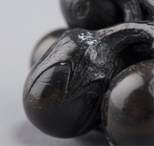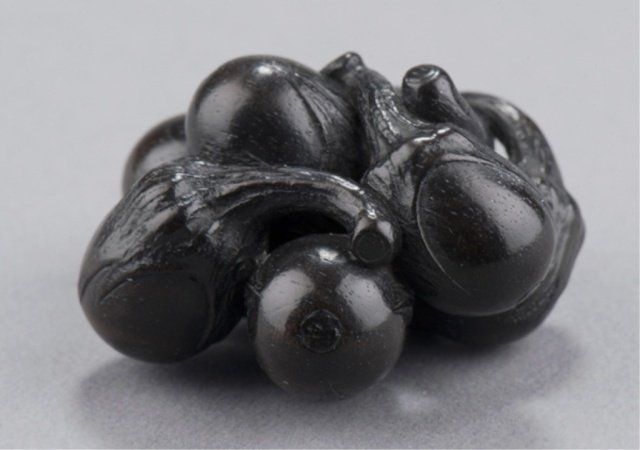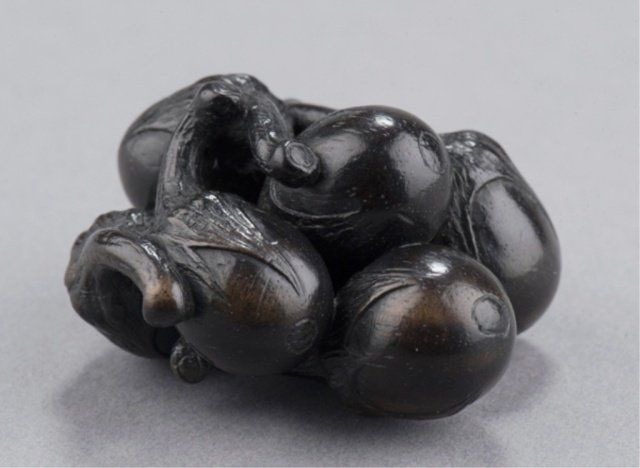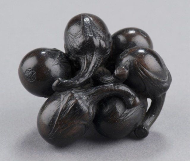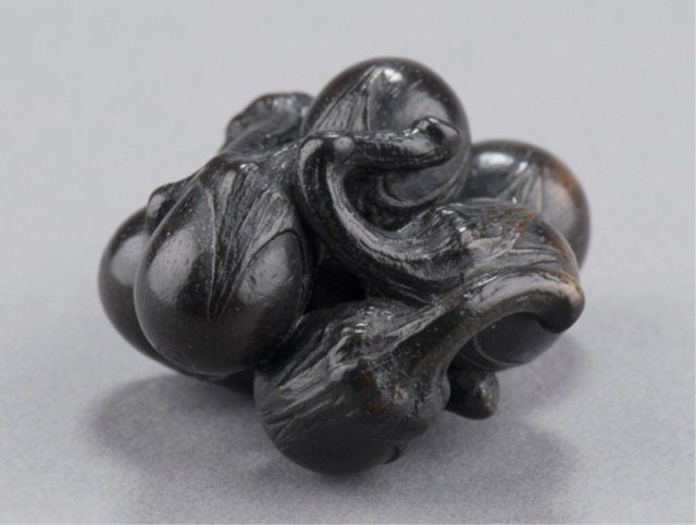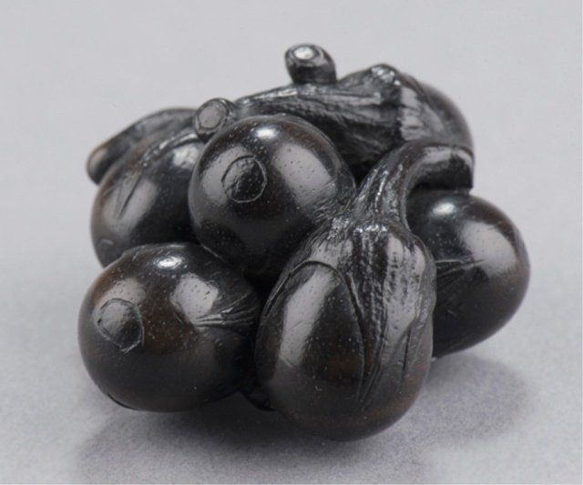 By Tadatoshi (circa 1770-1840), Nagoya, Mid 19th century. Seven nasubi each with its stem and calyx intact in a tightly compact group, realistically carved, the black kaki wood with its brown highlights giving a natural appearance, the himotoshi use a natural opening. Signed in ukibori without reserve in the recess of a calyx, Tadatoshi, very difficult to locate. 1in (2.6cm). Provenance: Purchased from Joseph U. Seo, 1957.