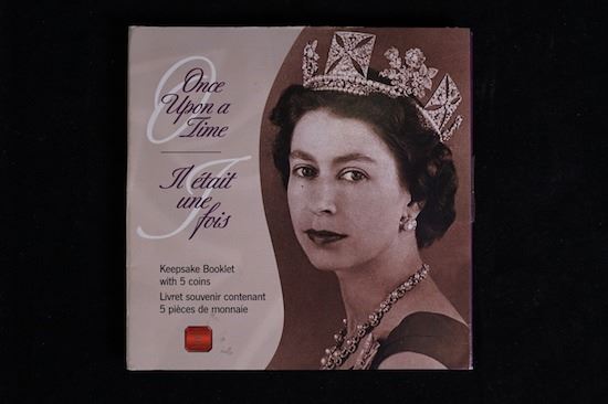A keepsake booklet with 5 coins.Commemorating a glorious regin of 50 years from 1952-2002 Elizabeth II becom a queen. Condition as is, shown in photos.
