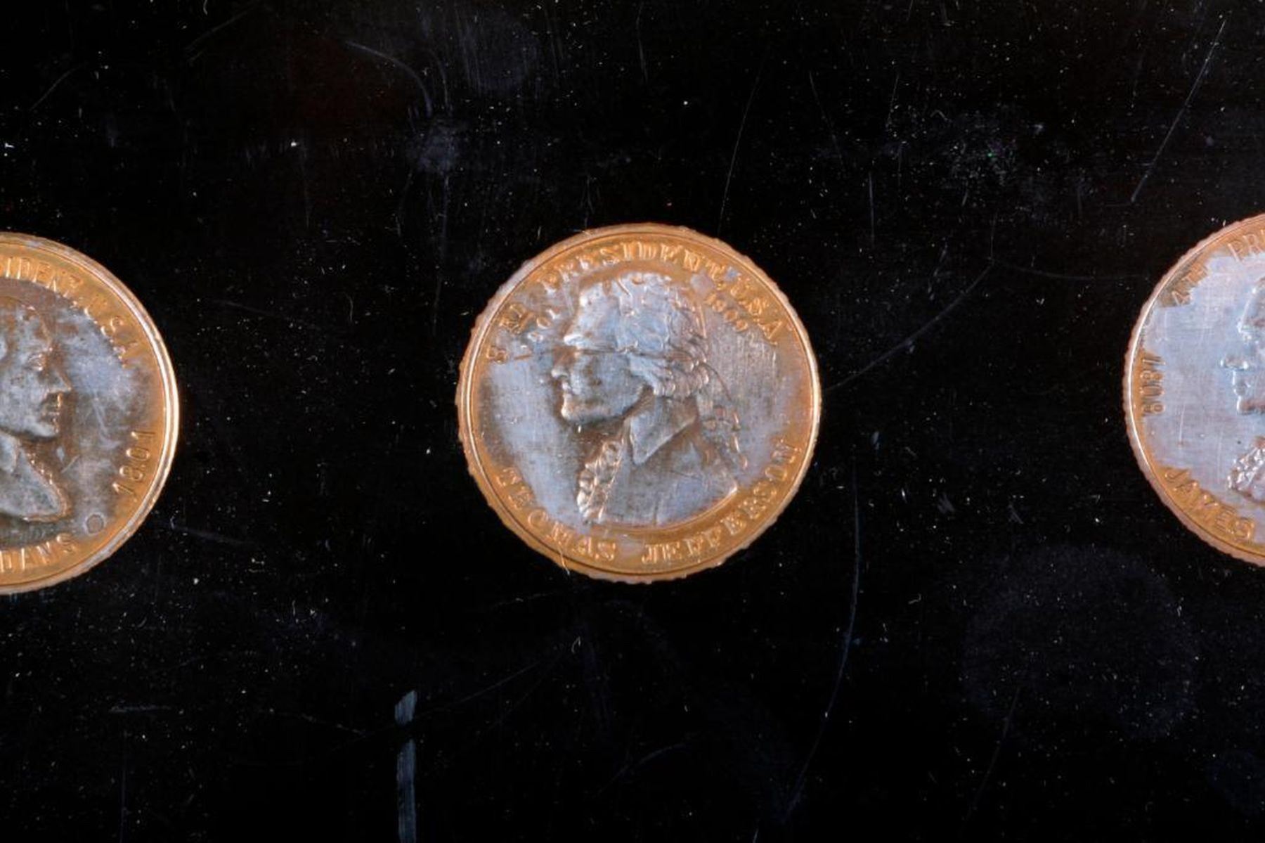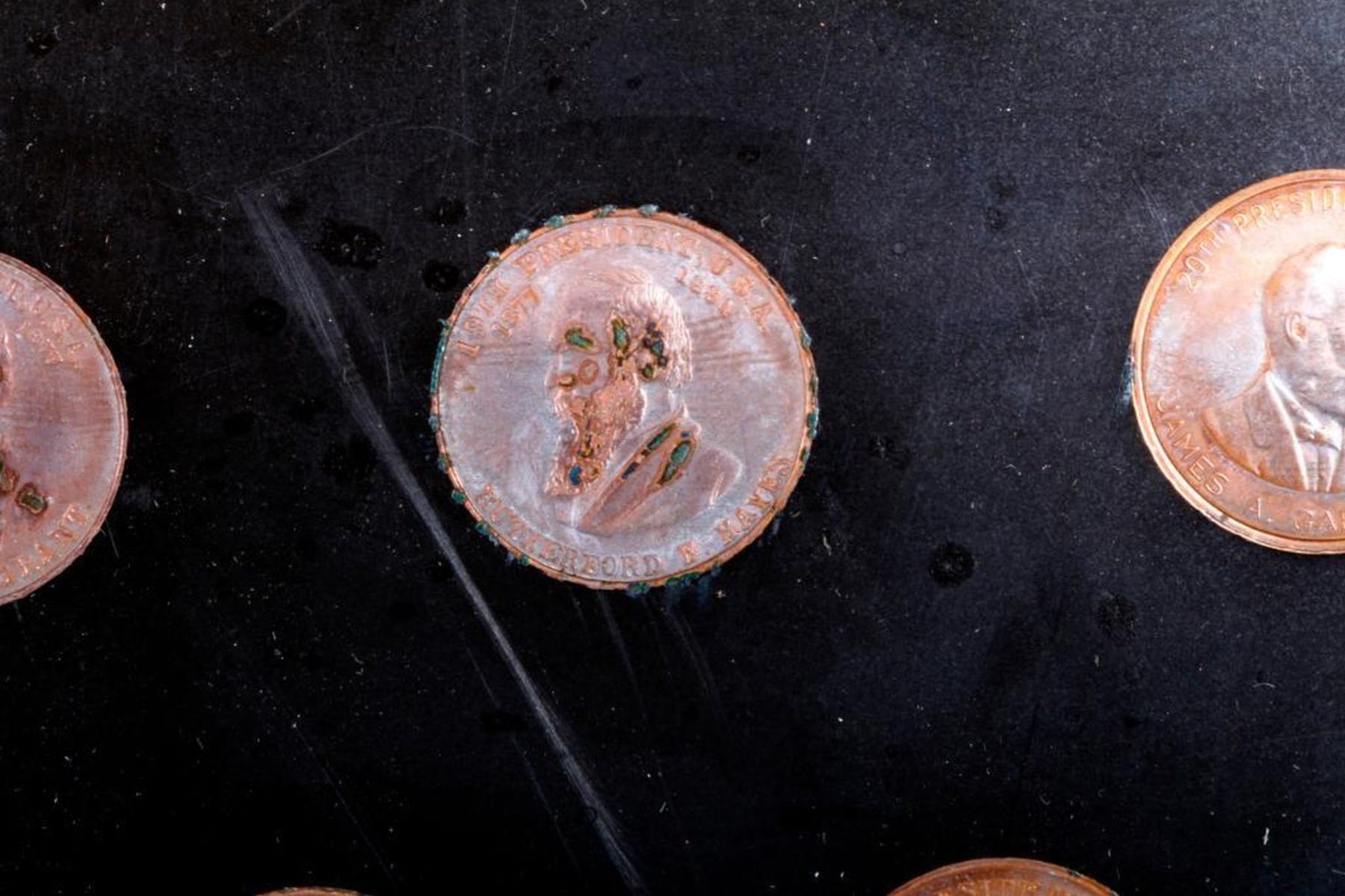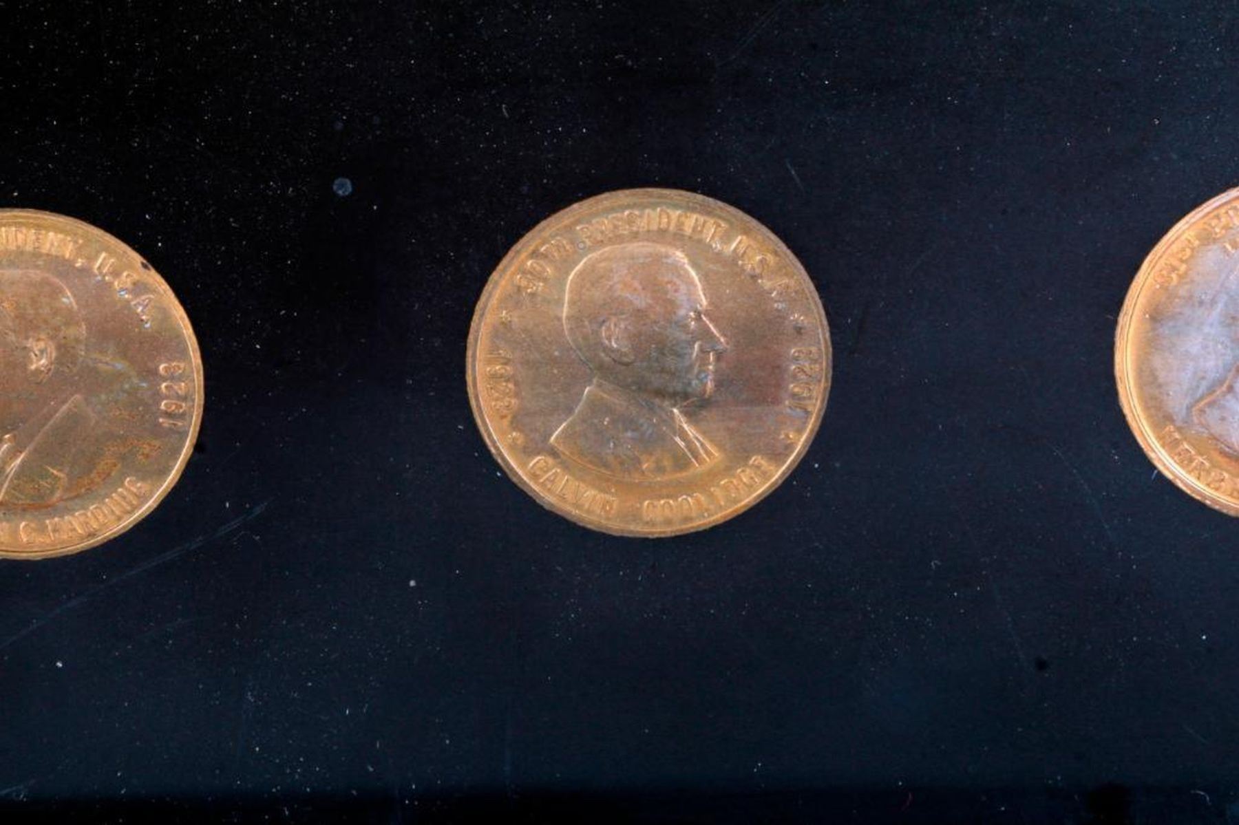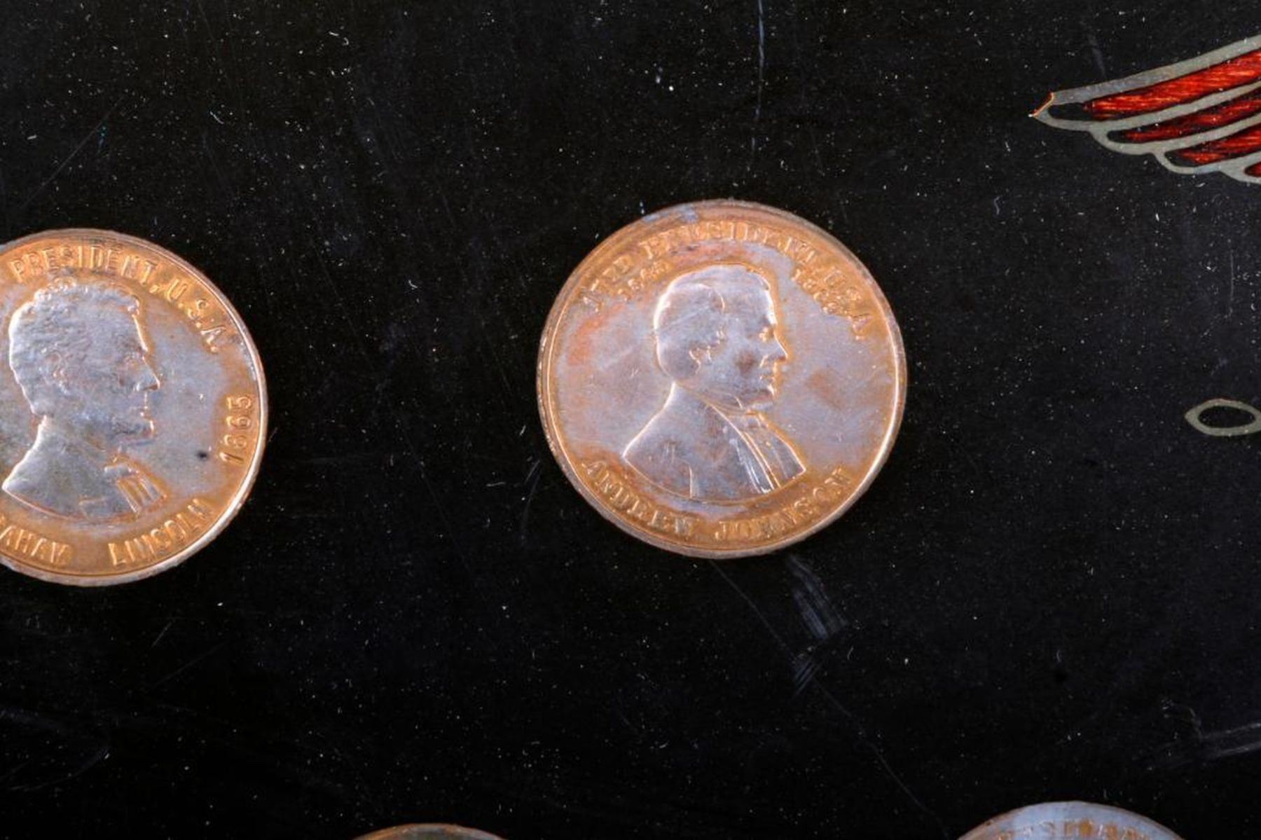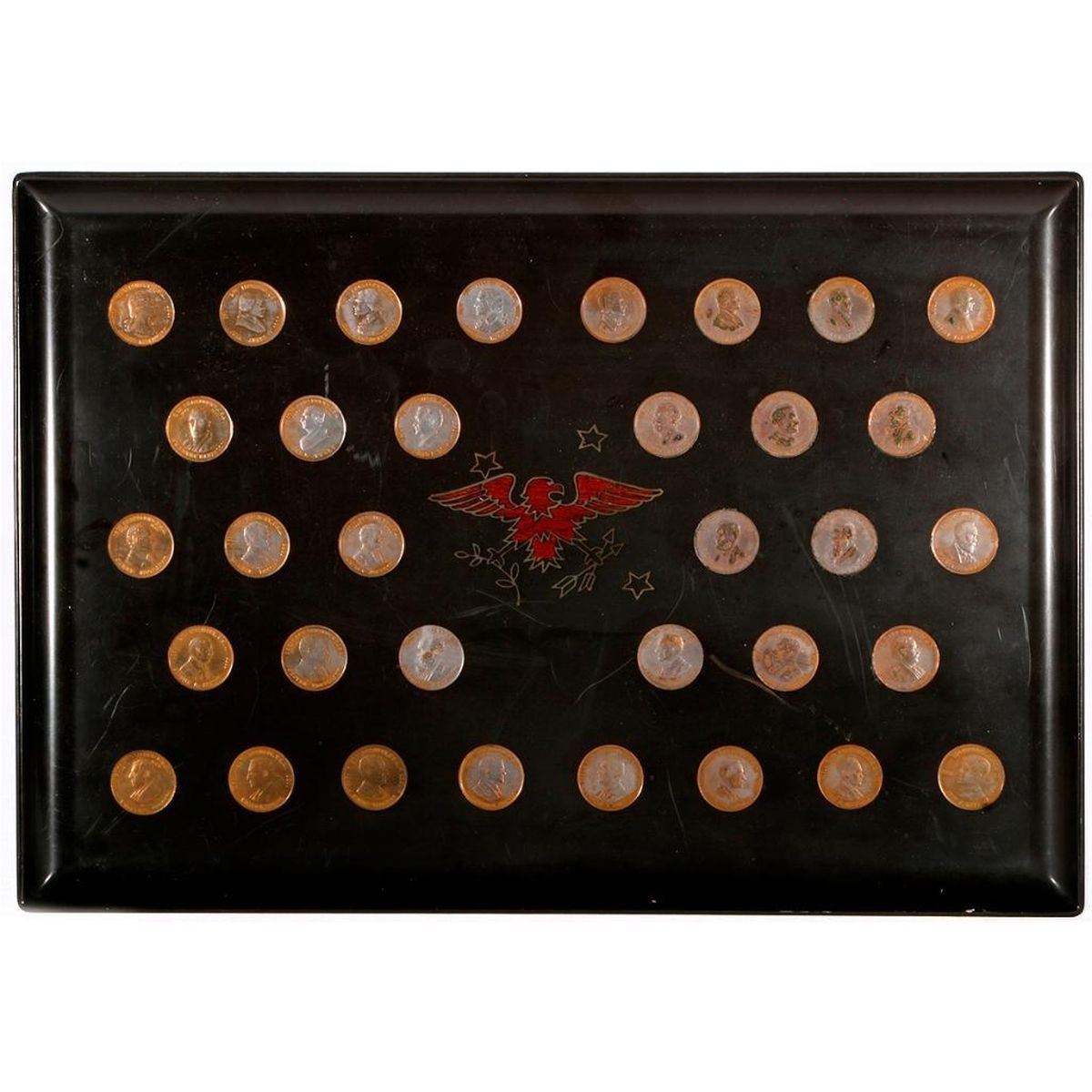 A mid 20th century lacquer tray with commemorative presidential coins from Washington to Kennedy measuring 12 1/2 inches high x 18 wide.