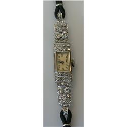 A lady's platinum cased cocktail watch with rectangular bezel and silvered dial printed with Arabic numerals, the shoulders containing 46 brilliant cut diamonds, on a black woven bracelet £500-800