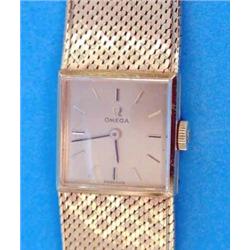 A ladys 18ct gold Omega wrist watch with integral flexible bracelet and square dial. £250-300