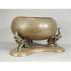 A large 19th century copper bowl inlaid with silver on a matching stand with elephant supports Est. 100/150