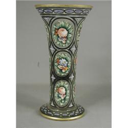 A large 19th century glass vase with a flaring rim, decorated with oval panels of hand painted fl...