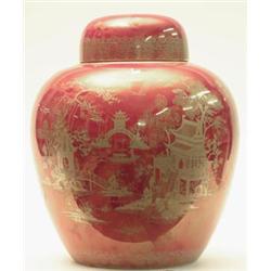 A large Carltonware jar and cover gilded with chinoiserie themes against a red ground, pattern 28...