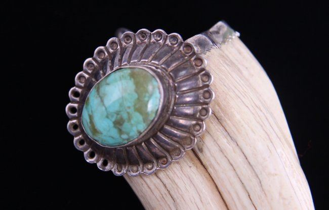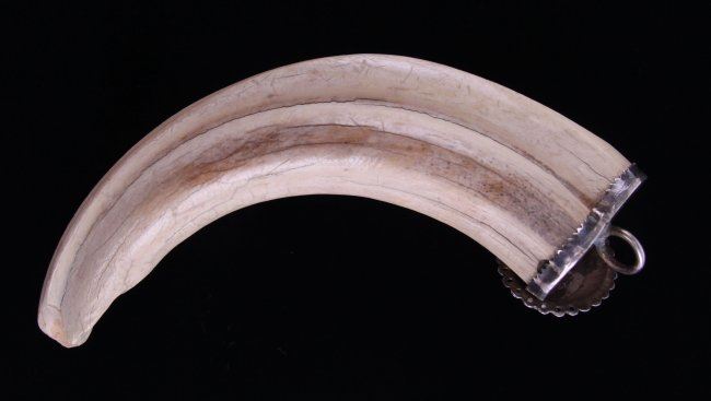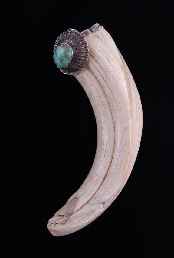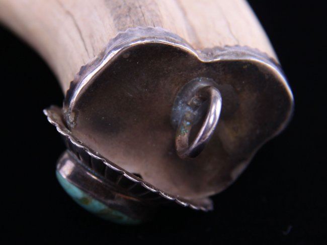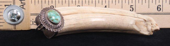 A large Native American sterling silver and turquoise boar's tooth. This is an exceptional work of art. (Size: See second photo for measurement.) Photos are part of the description representing the condition report. Pangaea Auctions urges Bidder's to view all attached photos.