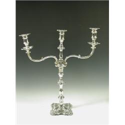 A large Victorian silver plated candelabrum with two scrolled branches on a cast square loaded base, 60cm high