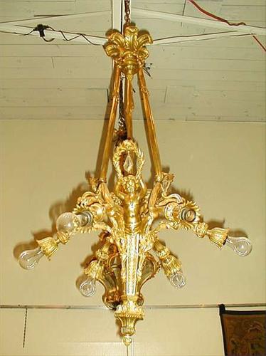 A large antique French bronze dore chandelier. The torch form base with six scrolled arms decorated with figures of three cupids. Three stylized rope supports. Approx. 45" long. 8000-10000