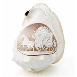 A large cameo shell, one side carved in relief with a large family of Italian peasants in a cart....