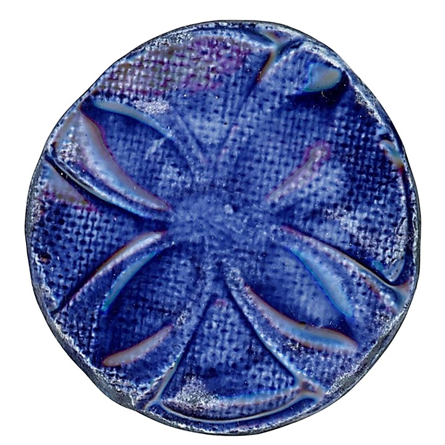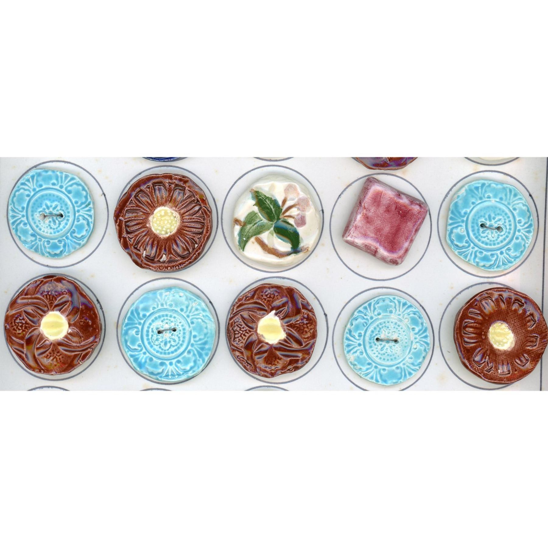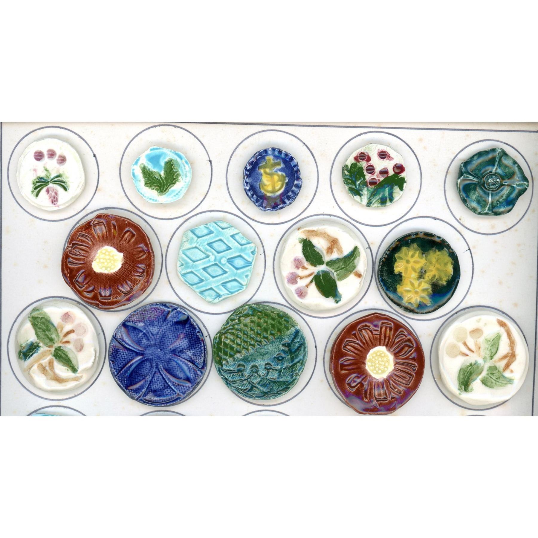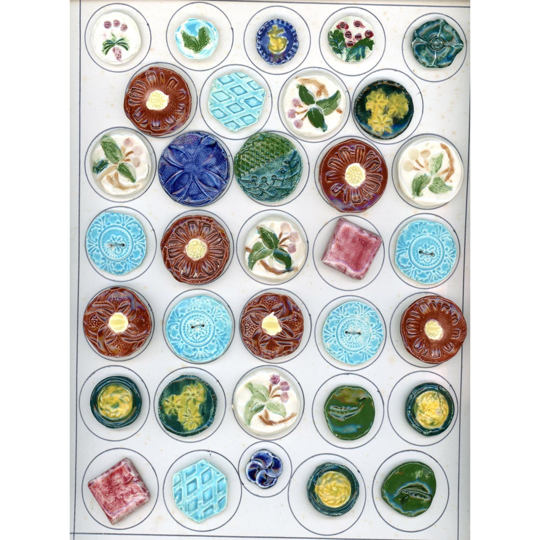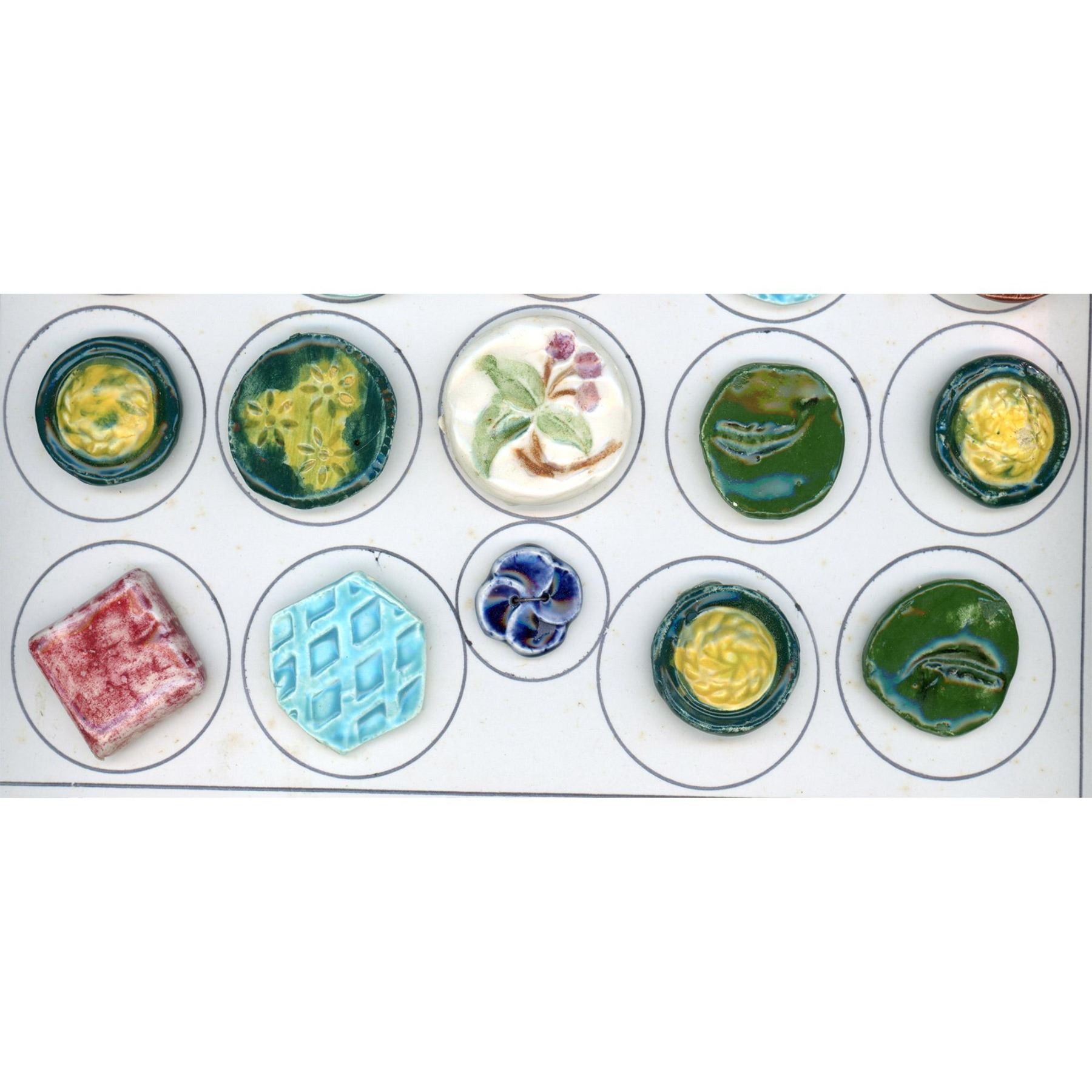 34 Medium/Large assorted colorful handmade ceramic buttons. We are not familiar with who handmade these colorful ceramic buttons but the card includes several of the same examples of different styles and in different colors, Very cool, buttons actually. The card on the back says made in 1959 by Bertha Rutta in Worcester Mass.