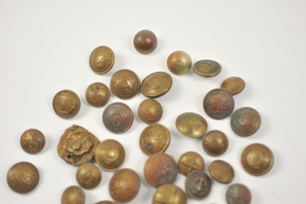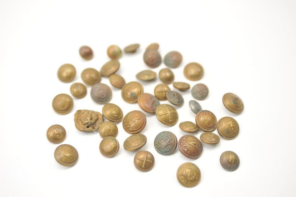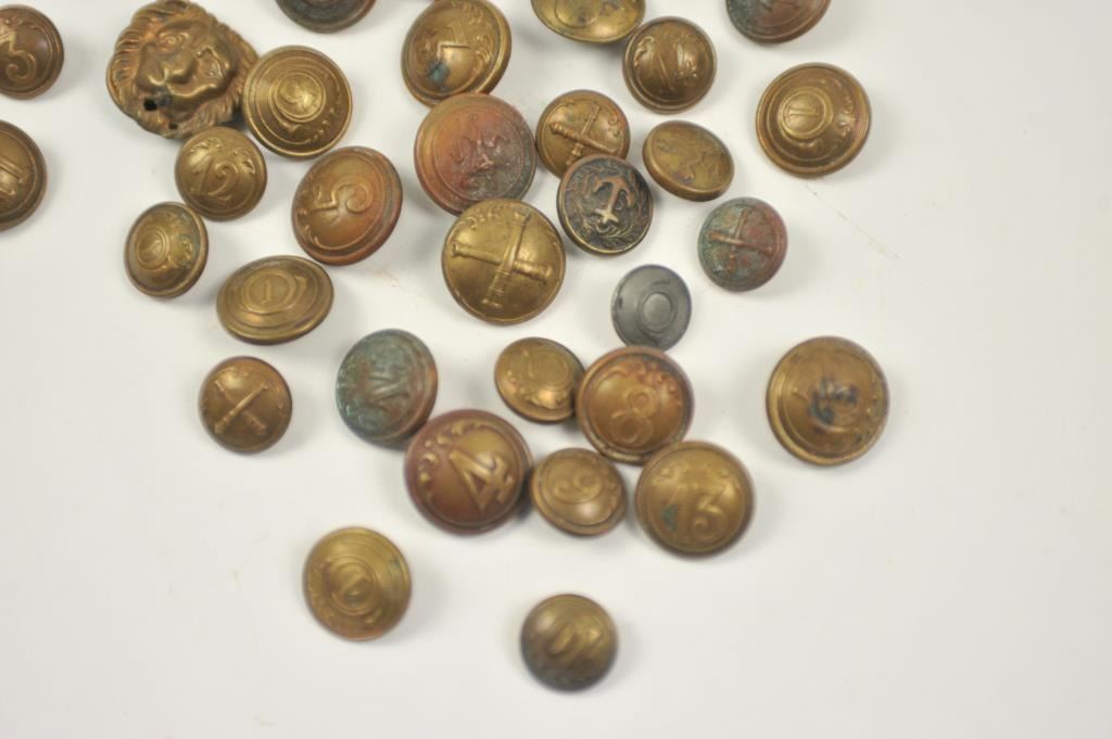 A large collection of mostly 19th century military brass buttons. Various regiments. Some American and some foreign. Over 40 buttons in mostly good condition. Est.: $75-$150