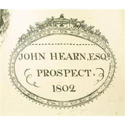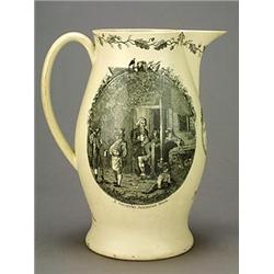 A large creamware Liverpool-printed oviform dated commemorative jug, printed in black with two oval panels, one titled A COUNTRY ALEHOUSE DOOR., depicting patrons before the alehouse door, the other depicting a village scene, names for JOHN HEARN, ESQr. PROSPECT. and dated 1802, 35.5cm high (large hole through base, cracks) (see illustration) £400-600