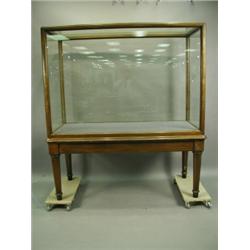 A large early 20th Century brass framed display cabinet, with a double shelf display and 2 end doors, on a wooden stand, 190cm high x 176cm long x 78cm deep
