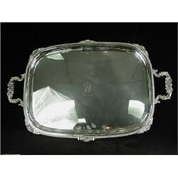 A large electroplated tray with a cast gadrooned and shell border, the centre engraved with an A....