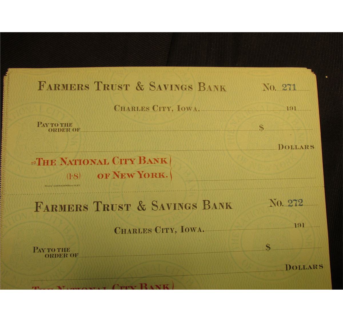 A large group of Three-piece Sheets of blank Checks from 1910 era "Farmers Trust & Savings Bank Charles City, Iowa" to be drawn on "The National City Bank of New York." Numbered checks start at No. 271 and go to 348 with some sheets missing in between.