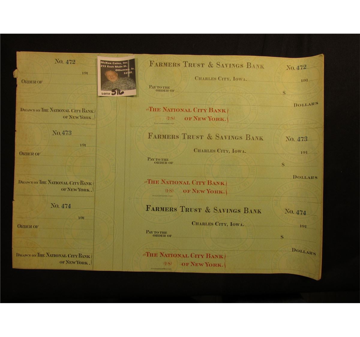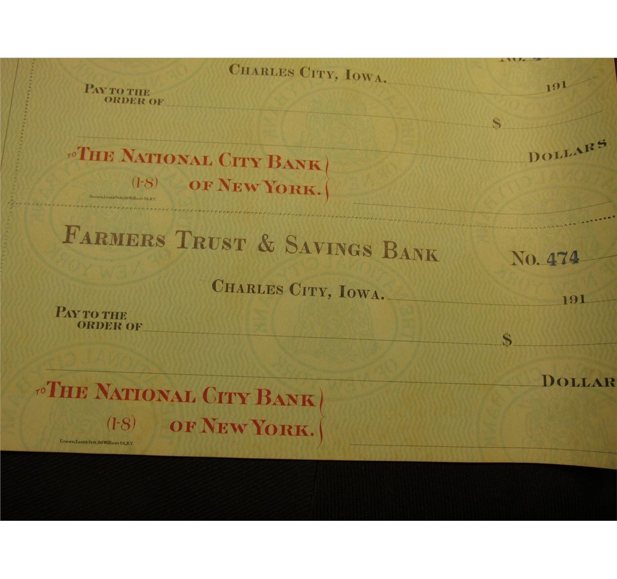 A large group of Three-piece Sheets of blank Checks from 1910 era "Farmers Trust & Savings Bank Charles City, Iowa" to be drawn on "The National City Bank of New York." Numbered checks start at No. 472 and go to 495.