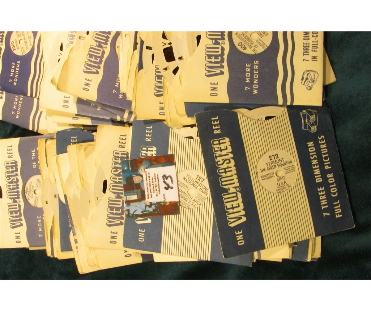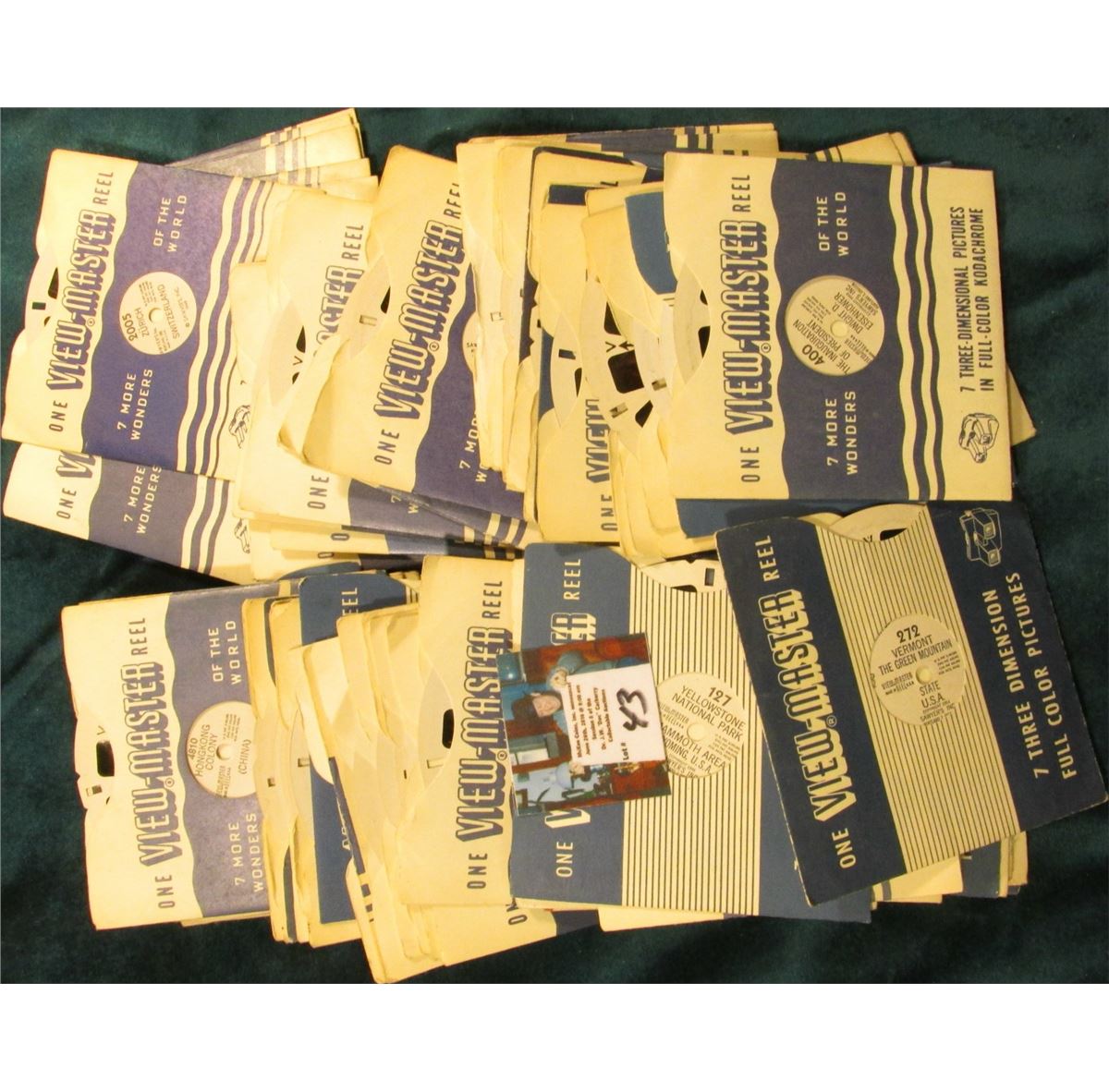 A large group of over 90 different View-master Reel Cards. Includes such views as "The Inauguration of President Dwight D. Eishenhower", "Space 1999 War Games", "Lookout Mountain", "Zion National Park", "Grand Coulee Dam", "Colonial Williamsburg", and much much more.