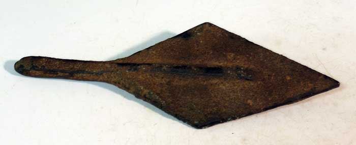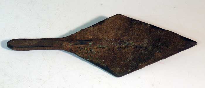 A large iron spear or javelin point from Western Persia, c. 1000 - 600 BC, the blade of elongated diamond shape with prominent mid-rib characteristic of the type. L: 5 1/8 in. In excellent condition, with strong mineral encrustation. Ex Pipes collection.