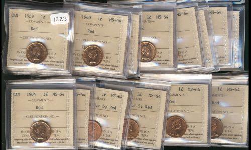 A large lot of 21 ICCS MS64 Red pennies. Includes 1959 (2), 1960 (2), 1961 (2), 1962 (2), 1963 (2), 1964 (3), 1965 LB Blt (2), 1965 SB Ptd, 1966 (3), 1970, 1979. Sold as is, no return.