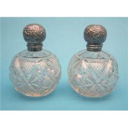 A large pair of Edwardian silver mounted cut glass globular scent bottles, 6ins. £150-200