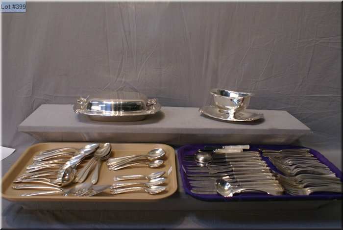 A large selection of Daffodil pattern silver plate flatware including knives, forks, teaspoons, tablespoons, dessert and shrimp forks, spreaders and serving pieces plus a Daffodil pattern sauce boat and a covered vegetable dish