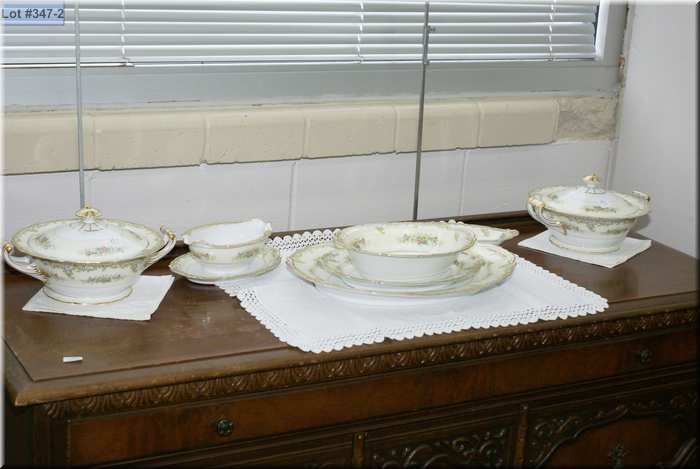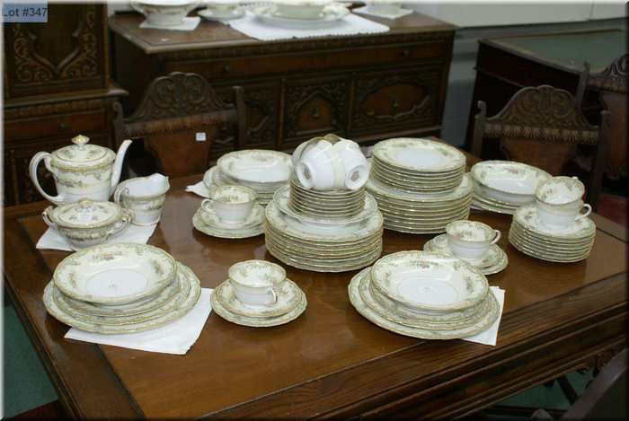A large set of Noritake "Rosario" china including dinner plates, luncheon, side and bread and butter plates, tea pot cream and sugar, soup bowls, cups and saucers plus two lidded vegetable dishes, one open vegetable dishes, platters, sauce boat etc.
