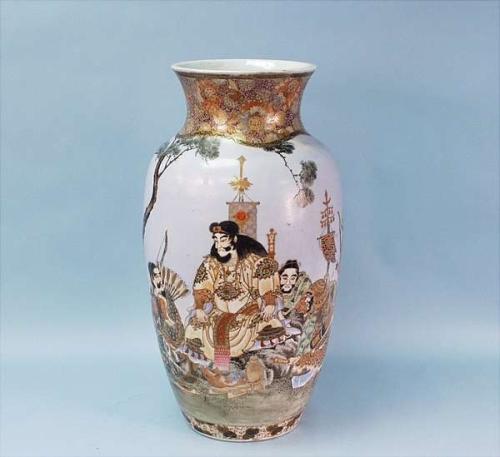 A large turn of the century Japanese Satsuma porcelain vase. The oviform body hand painted on light blue ground with samurai in martial outfits. Flaring neck with polychrome painted floral pattern. Signed and inscribed underside. 24" high. 3000-3500