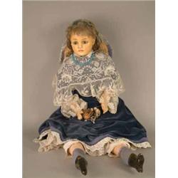 A large wax over composition shoulder doll, circa 1880, with fixed glass paperweight eyes and cloth body with painted composition limbs, blue velvet dress with undergarments, 35ins. £70-100