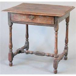 A late 17th century/early 18th century yew wood side table, with moulded two plank top, and frieze drawer fitted original simple brass loop handle, with engraved back plate on turned baluster legs and uniting H stretcher, 2ft.5.5ins. £700-1,000