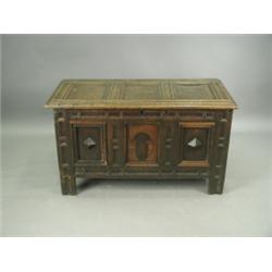 A late 17th/early 18th Century oak coffer with a geometric moulded 3 panel front, (some mouldi...