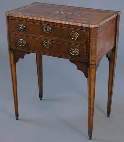 A late 18th century Continental side table, with star burst and parquetry banded top over two drawers on square tapered satinwood inlaid legs with later angle brackets, 2ft 2ins £500-700