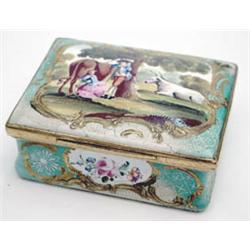 A late 18th century English enamel snuff box decorated with a pastoral scene, 3.25ins (restored) £150-200