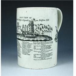 A late 18th century Liverpool creamware mug printed in black with the 'East View of Liverpool Light.