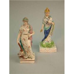 A late 18th century Staffordshire figure of Victory, standing on a square base, 8ins and a similar figure of Justice, 9ins. £350-500