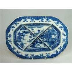 A late 18th century Turner's platter, the canted rectangular shape with raised central cross division dividing the blue printed chinoiserie scene of a man and dog chasing a stag before pavilions on an island, impressed mark and Prince of Wales feathers, 26cm wide £200-300