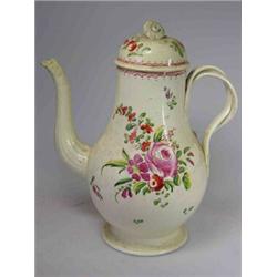 A late 18th century creamware coffee pot and cover, attributed to Leeds, the baluster shape painted with coloured flowers, the interlacing strap handle with leaf terminals, the cover with flower finial, 24.5cm high (R) (2) £300-400