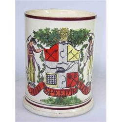 A late 18th century creamware mug printed in black and overpainted with a pseudo armorial supported by lady with a rake and man with a scythe above the motto 'God Speed the Plough', 12cm high (W) £200-300