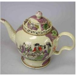 A late 18th century creamware teapot and cover, printed and overpainted by William Greatbatch with two scenes from the prodigal son, 'The Prodigal Son Receives His Patrimony' and 'The Prodigal Son Taking His Leave', gilt beading below the pierced gallery, the cover with a purple sponge band and angels heads (2) (B) £300-500