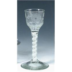 A late 18th century opaque twist wine glass with Jacobite implications, the bowl engraved with rose and bud on one side and with butterfly on the other, the double helix stem on circular foot, 14.5cm high (W) £100-150