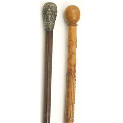 A late 19th century Indian silver handled walking stick, embossed with Gods and deities, together with a W.W.I. period walking stick carved in relief with flowers and carved with inscriptions, (2) £80-120