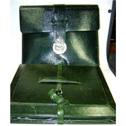 A late 19th century Leuchars green scrim writing case with concertina compartments and locking on a Chubb lock together with another similar (2) £100-150