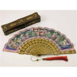 A late 19th century Oriental fan, the lacquered sticks and guards painted with figures in cartouches and flowers, the paper leaf painted on each side with figures in interiors, in fitted lacquered case, 11 ins. £180-250