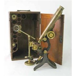 A late 19th century Swift & Sons lacquered brass compound microscope, with racked tube and side tube above a Wenham prism and pivoted on a shaped stand, with two lenses and other attachments in mahogany case, 17.5 ins £500-600
