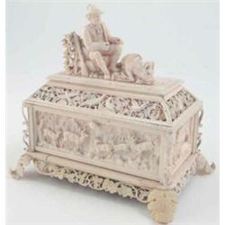 A late 19th century Swiss carved ivory casket, of rectangular form, the sides carved with relief panels of deer in woods, with pierced fretwork cover panels and apron, surmounted by a huntsman with a deer, 6.5 by 6.5 ins. £1,000-1,500