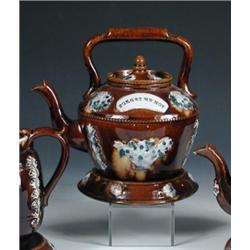 A late 19th century bargeware teapot, cover and stand, an arched 'Forget Me Not' sprig amongst others floral on the treacle brown ground, the cover with acorn knop, 24cm high overall (3) £80-120