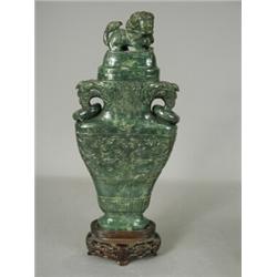 A late 19th century carved jade bottle vase, carved with relief palmettes, foliage and geometric decoration with ring mask handles, all upon a fretwork carved base, 33cm high Est. 200/300
