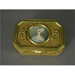 A late 19th century ormolu box, the rectangular top with canted corners, the centre inset with a painted portrait miniature signed Theo, the body with applied cast leaf and ribbon decoration, 8 x 11cm Est. 450/550