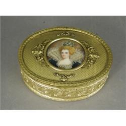 A late 19th century ormolu oval box, the hinged cover with a painted portrait miniature reputed t...
